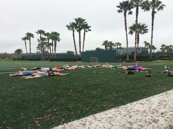 The weather was once again interesting. Whereas Saturday’s game was played in 85-degree searing sun, this match was preceded by an afternoon-long thunderstorm which dumped so much rain that the venue was changed from the grass fields of Monroe School to the artificial turf of the Ed Radice complex. It’s almost become a home from home; as if to make the girls even more at home, the temperature for the 7.30pm kick-off was a noticeably cooler 67 degrees, and after a beautiful Floridian sunset, much of the game was played in more rain – warmer than British precipitation but just as moist.
